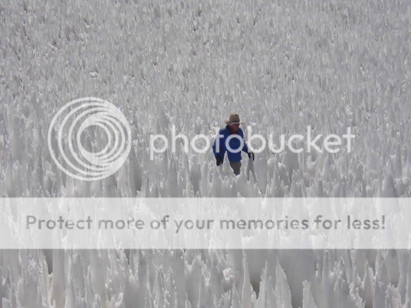 | 3. Penitente Spoiler for gambar 3: Inilah lidah es tajam, yang disebut sebagau penitente, karena mirip dengan prosesi para biarawan dengan tudung putih yang mencuat. Fenomena ini ditemukan di glacier (padang es). Ukurannya sangat bervariasi, dari beberapa cm sampai 5 meter. Ini terbentuk karena cahaya matahari yang menyebabkan adanya cekungan di permukaan salju. Begitu cekungan ini terbentuk, cahaya matahari akan saling memantul dalam cekungan yang ada, dan menyebabkan pendalaman dalam cekungan. Semakin dalam cekungan yang ada, semakin tajam lidah es yang terbentuk. |